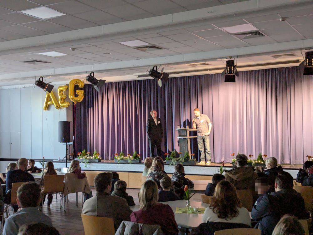 Am sehr gut besuchten Samstagvormittag lernten vor allem unsere jungen Besucherinnen und Besucher, aber auch ihre Familien das Einstein kennen: Da konnte man live bei der Herstellung von Elefantenzahnpasta dabei sein, selbst mikroskopieren, die Darbietungen des Schulorchesters oder der Tanz-AG auf der Bühne bestaunen, sich über das Weltall informieren, dem 3D-Drucker bei der Arbeit zuschauen, eine Herzdruckmassage vornehmen, mathematische oder französische Spiele spielen, ein englisches Theaterstück schauen, trommeln oder sich in der Turnhalle sportlich betätigen.